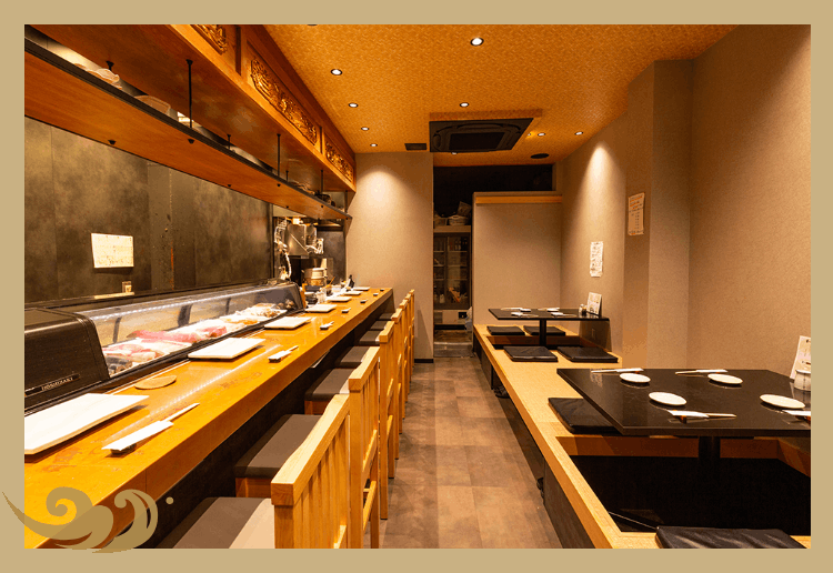 特徴的な銅張りのカウンター席では、大将の手仕事を目の前に、本日のおすすめや旬の味わいをご案内いたします。職人との会話を交えながらお食事を愉しめるのも、当店ならではの魅力です。店内にはカウンター10席に加え、4名様用の掘りごたつテーブルを2卓ご用意。お子様連れのお客様も歓迎しております。